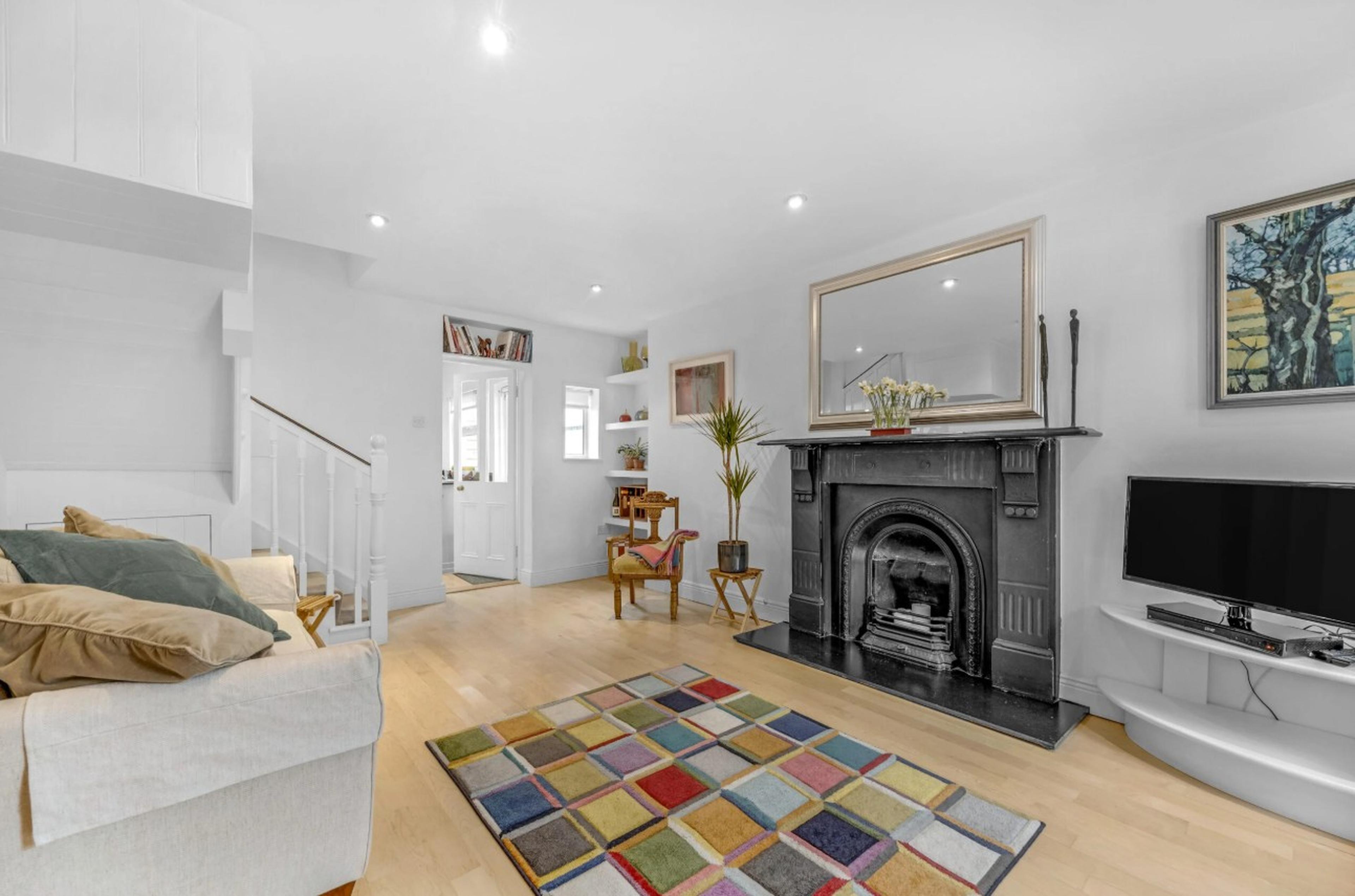 Attractive living space with striking cast iron fireplace.